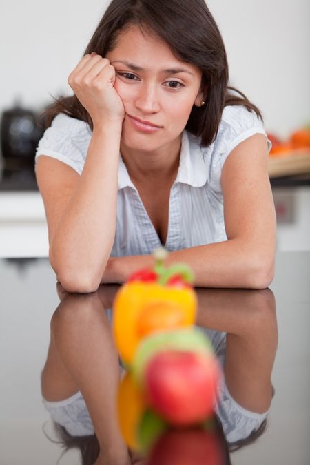 Woman looking at some fruits bored of healthy eating