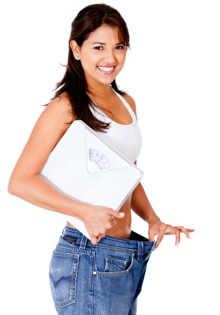 Woman in loose pants after loosing weight and holding a scale - isolated