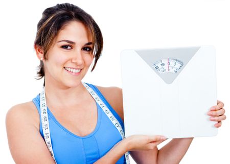 Woman loosing weight and holding a scale - isolated