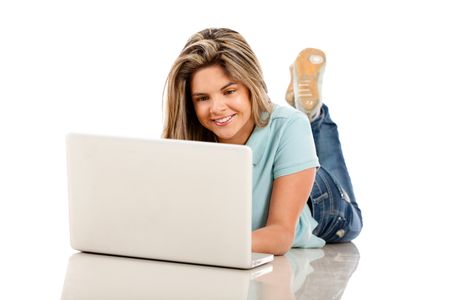 Woman lying on the floor with a laptop computer - isolated