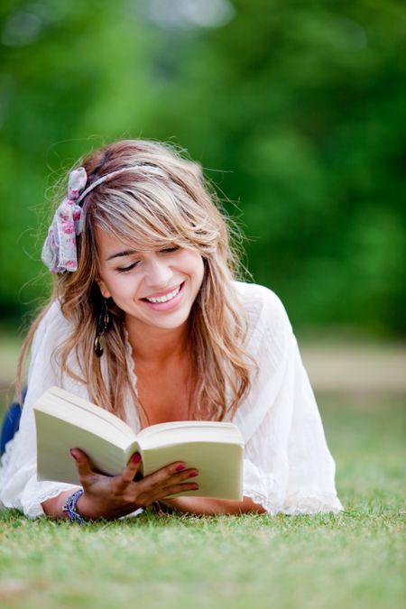Woman lying on the grass reading a book ? outdoors