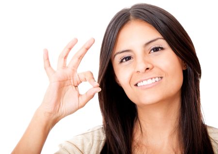 Woman making an ok sign - isolated over a white background