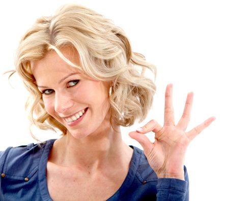 Woman making an ok sign isolated over a white background
