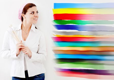 Woman painting a wall of the house and choosing from different colors