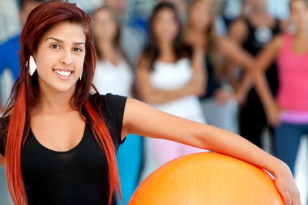 Woman with a pilates ball at the gym and smiling