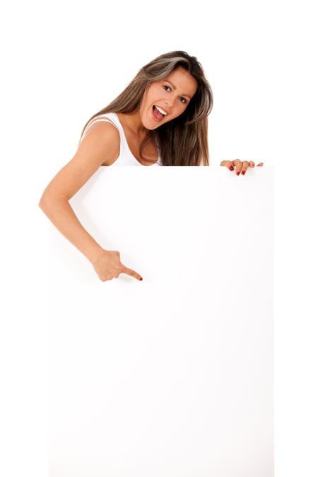 Woman pointing at a banner ad - isolated over a white background
