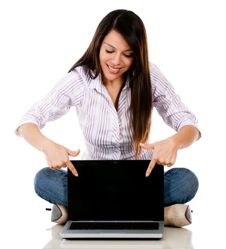 Woman pointing a laptop - isolated over a white background