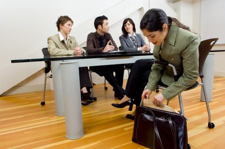 Woman pulling resume out of briefcase at interview.