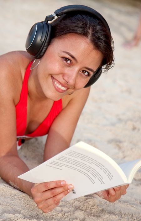 Woman reading a book and listening music on the beach