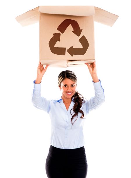 Woman with a recycling cardboard box - isolated over white