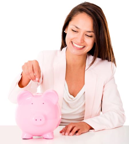Woman saving money in a piggybank - isolated over a white backgorund