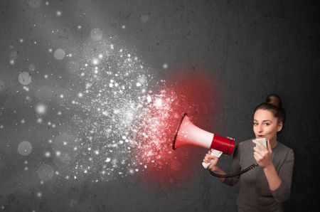 Woman shouting into megaphone and glowing energy particles explode concept