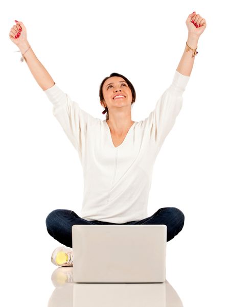 Woman sitting on the floor with a laptop computer and arms up - isolated