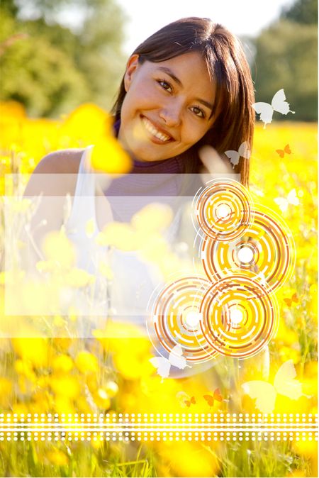 Woman smiling outdoors with flowers and butterflies