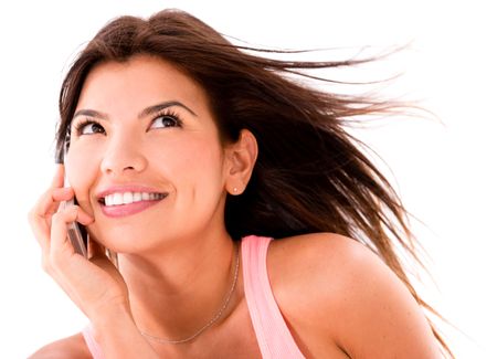 Woman talking on her cell phone - isolated over a white background