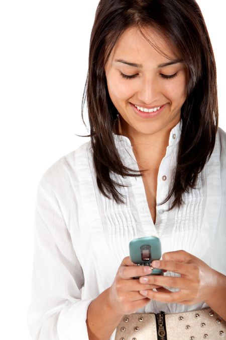 Woman texting on her cell isolated over a white background
