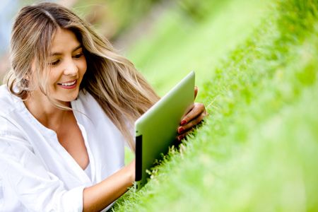 Woman using a tablet computer outdoors - technology concepts