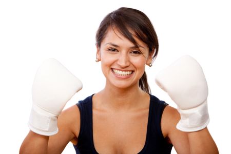 Woman wearing boxing gloves - isolated over white