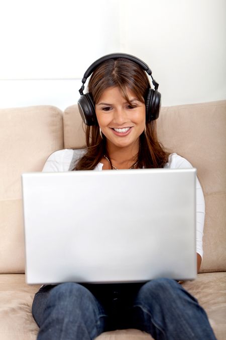 Woman wearing headphones downloading music from her computer