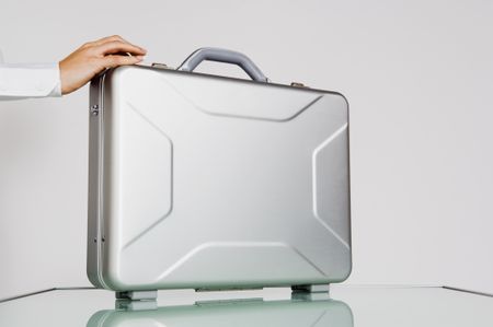 Woman's hand on a brief case.