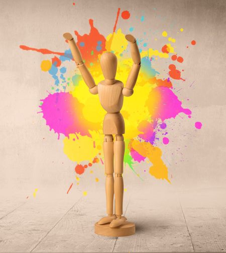 Wooden mannequin posed in front of a greyish background with colorful splashes behind it
