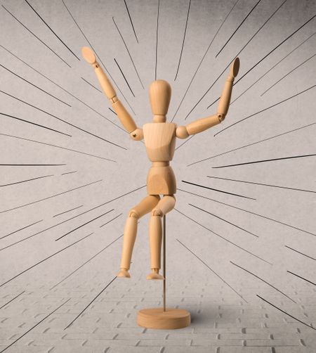 Wooden mannequin posed in front of a greyish background with black lines around him