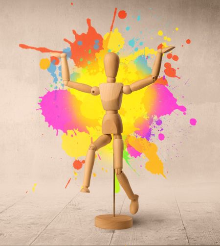 Wooden mannequin posed in front of a greyish background with colorful splashes behind it