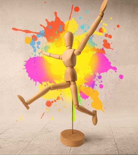 Wooden mannequin posed in front of a greyish background with colorful splashes behind it