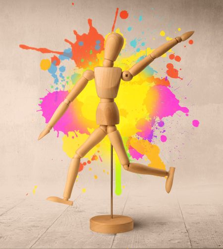 Wooden mannequin posed in front of a greyish background with colorful splashes behind it