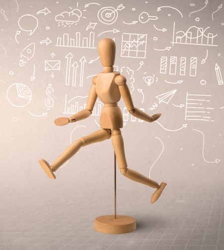 Wooden mannequin posed in front of a greyish background with white scribbled data around him