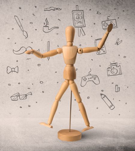 Wooden mannequin posed in front of a greyish background with hobby related scribbles behind it