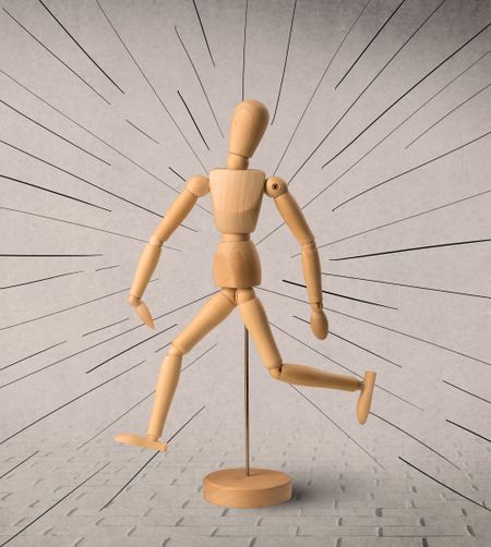 Wooden mannequin posed in front of a greyish background with black lines around him