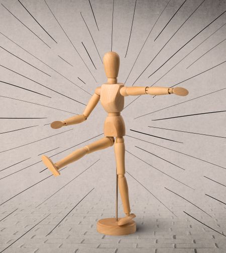 Wooden mannequin posed in front of a greyish background with black lines around him