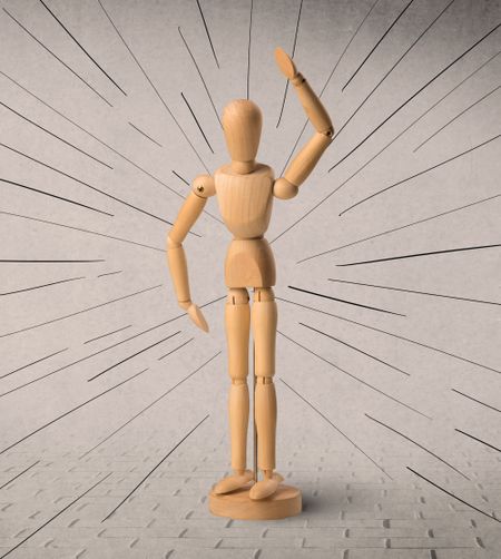 Wooden mannequin posed in front of a greyish background with black lines around him