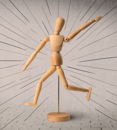 Wooden mannequin posed in front of a greyish background with black lines around him