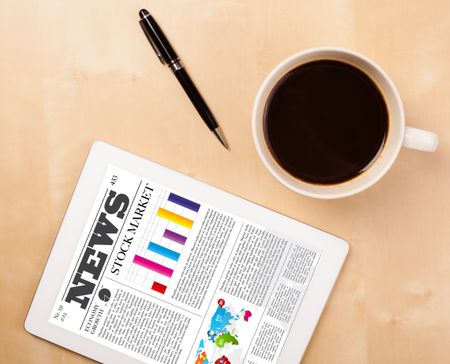 Workplace with tablet pc showing latest news and a cup of coffee on a wooden work table close-up