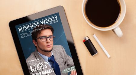 Workplace with tablet pc showing magazine cover and a cup of coffee on a wooden work table close-up