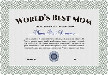 World's Best Mom Award Template. With guilloche pattern. Border, frame.Superior design.