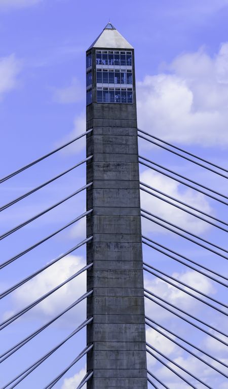 World's tallest public bridge observatory (420 feet [128 meters] tall), with unidentifiable tourists on three floors at the top, at Penobscot Narrows Bridge, Prospect, Maine, USA