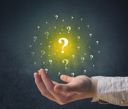 Yellow question marks hovering over young hand