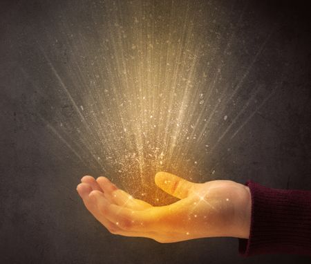 Yellow ray of light coming from a young hand