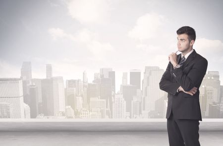 A young adult businessman standing in front of city landscape with skyscraper buildings and clouds concept