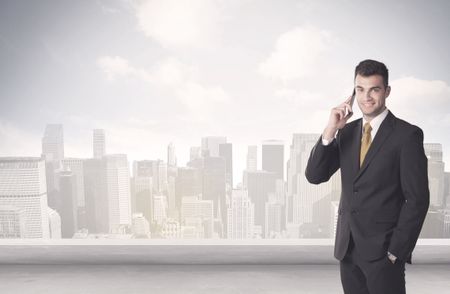 A young adult businessman standing in front of city landscape with skyscraper buildings and clouds concept