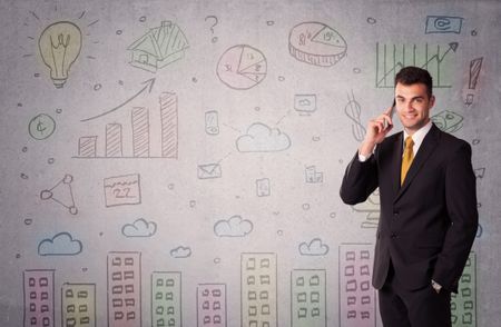 A young adult businessman standing in front of a wall with colorful drawings of buildings, charts, graphs, signs concept