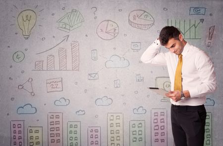 A young adult businessman standing in front of a wall with colorful drawings of buildings, charts, graphs, signs concept