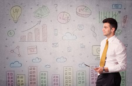 A young adult businessman standing in front of a wall with colorful drawings of buildings, charts, graphs, signs concept