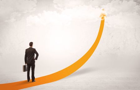 A young adult salesman standing on a big orange arrow pointing up in a bright empty space concept