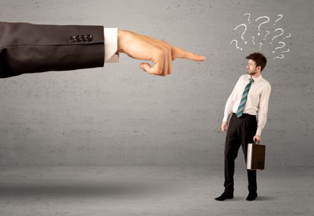 Young amateur confused businessman not understanding why he is getting fired concept with drawn question marks and large boss hand pointing at him