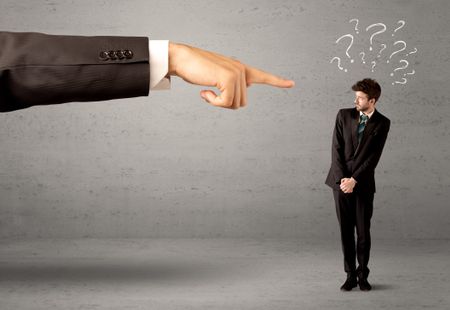 Young amateur confused businessman not understanding why he is getting fired concept with drawn question marks and large boss hand pointing at him