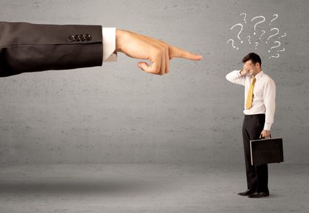 Young amateur confused businessman not understanding why he is getting fired concept with drawn question marks and large boss hand pointing at him